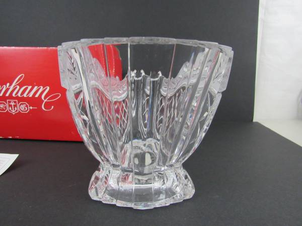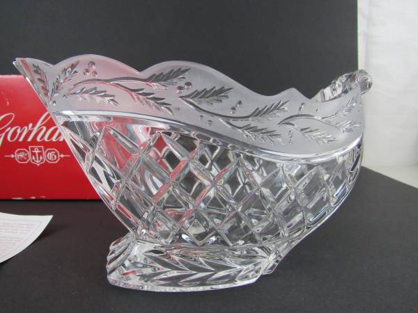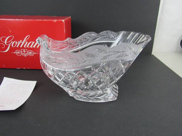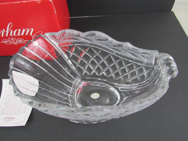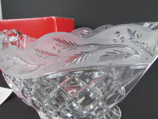 This is a brand new unused crystal centerpiece bowl. There is no cracks, scratches, or chips. The box was opened for inspection of the item and then stored away and only the box has minor age and storage wear. This a very beautiful bowl that is great decorative crystal with a frosted top border on the left and right side with a leaf design in the frosted area. The bowl is 5 5/8" tall and 9 7/8" from front to back and 1/4" thick and weighs 5Lbs. This beautiful bowl is very heavy duty crystal bowl and even though technically it is considered Holiday traditions it could be used year round because of it's decorative style and appearance. Made In Germany.