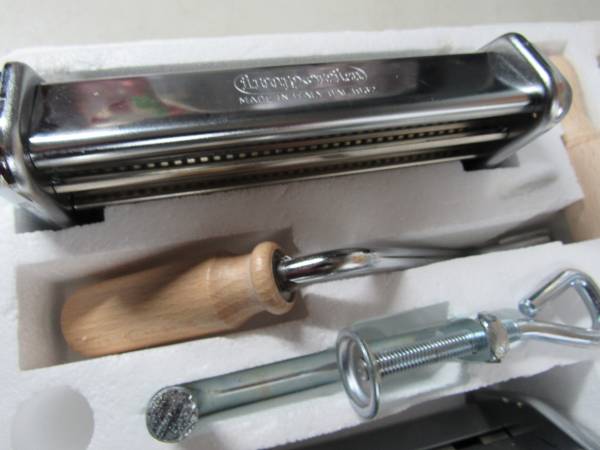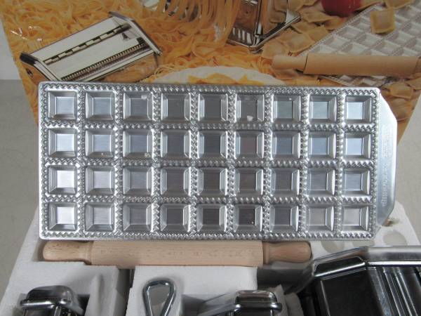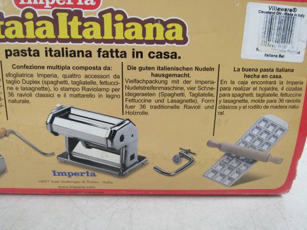 Pasta Maker Machine by Imperia- Heavy Duty Deluxe Set w 2 Attachments, Made in Italy, Ravioli Mold & Rolling Pin, Steel Construction w/ Wooden Grip Handle, Make Fresh Authentic Italian Noodles. No missing parts. outer box has some minor storage wear.