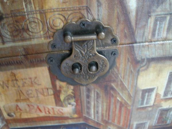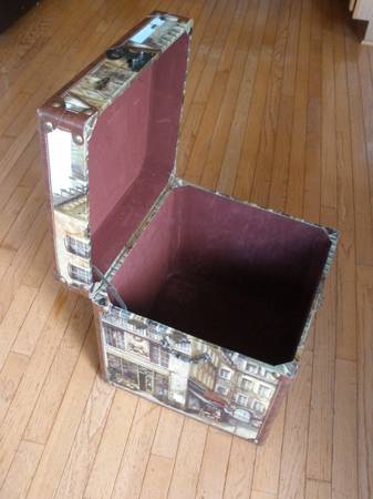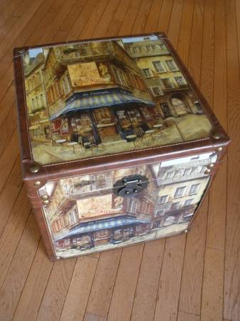 For sale is a PAIR of PARIS THEMED STACKABLE STORAGE BOXES. These decorative cube shaped storage trunks or boxes are designed to look like vintage luggage and feature an illustration of a Parisian street scene. The wood boxes are covered in vinyl and easy to clean. The tops of both boxes are hinged and have meal decorative carry handles. The edges are covered with a faux leather. The interior of the boxes are felt lined. Both boxes are in excellent condition. The smaller cube can be stored in the larger cube. These decorative boxes are great storage boxes. Take both for a total of $40.
