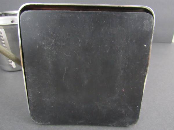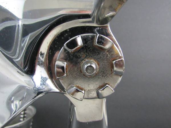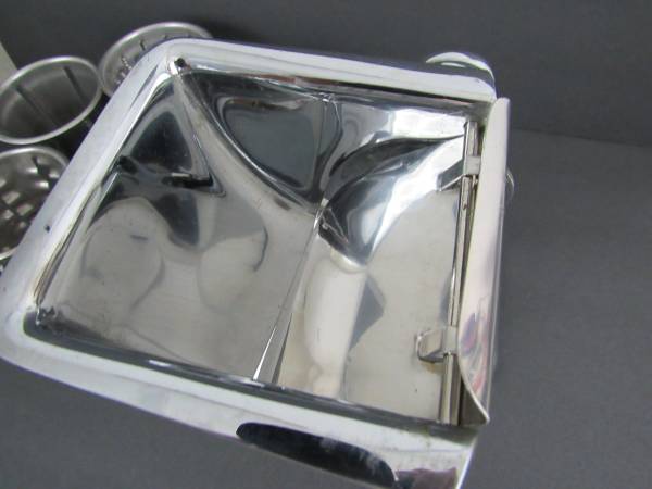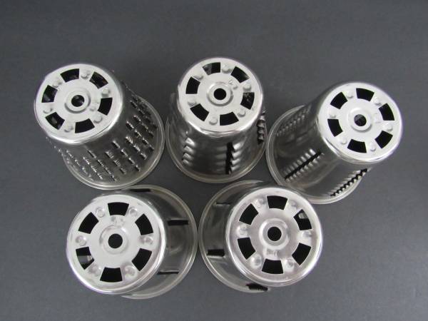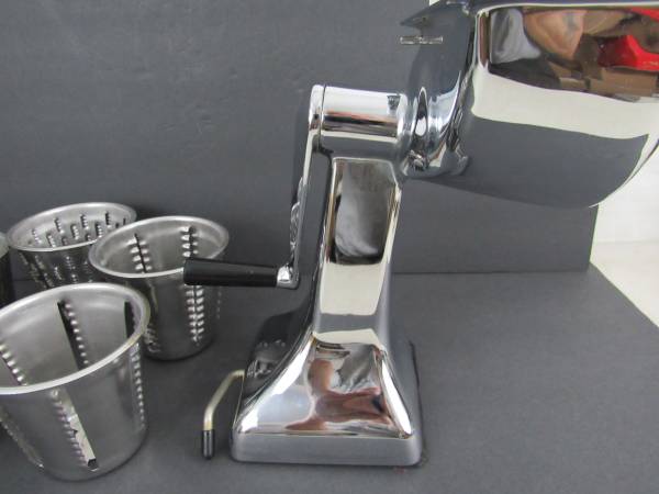 The food processor is 10" height X 9 3/4" length X 5" depth. Made of chrome plated metal. Comes with 5 different cutting cones. The machine is for temporary counter or table top mounting, and is easy to mount and is to remove. Very good working and cosmetic condition with some minor age and usage wear. No broken or missing parts. Made in USA