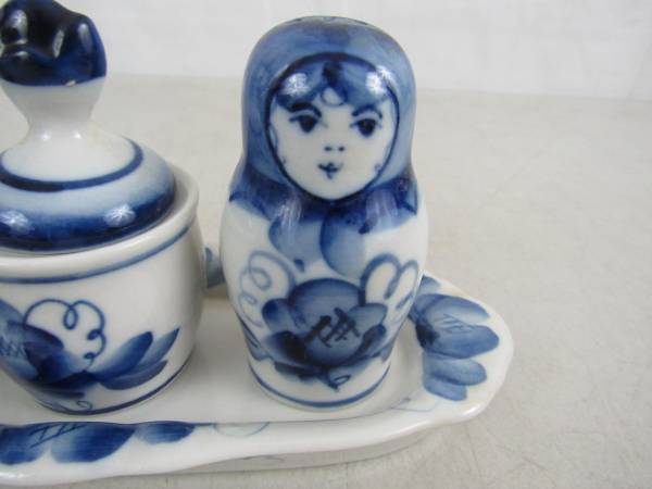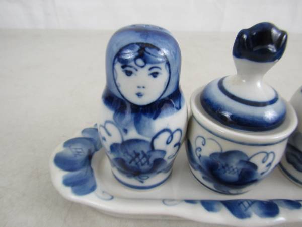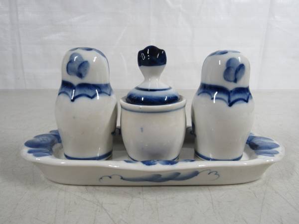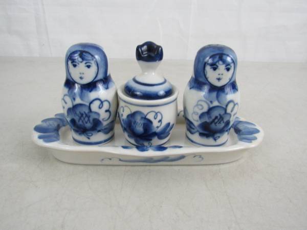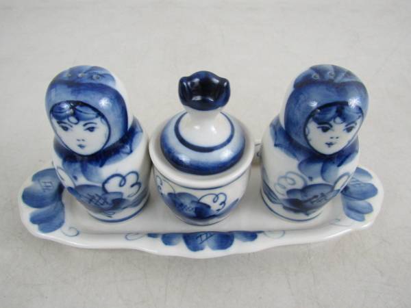 The set is in excellent condition, and was only used as a display item. The set is 8 3/8" length X 3 7/8" height X 3 1/4" width. Made in Russia. There is no stoppers, or corks for the shakers.No...