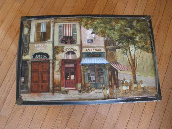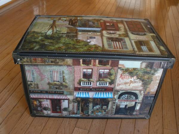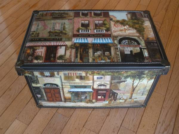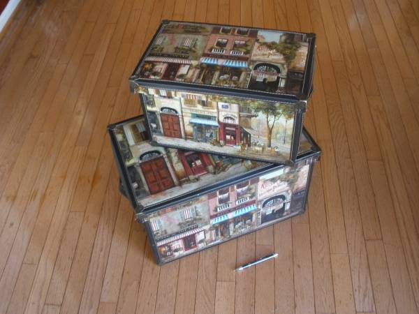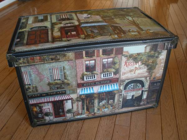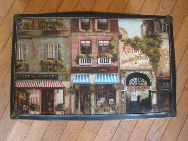 For sale is a PAIR of PARIS THEMED STACKABLE STORAGE BOXES. These decorative rectangular shaped storage trunks or boxes are designed to look like vintage luggage and feature an illustration of a Paris Café street scene. The wood boxes are covered in vinyl and easy to clean. Both boxes are have leather decorative carry handles. The edges are covered with a faux leather. The interior of the boxes are felt lined. Both boxes are in excellent condition. The smaller box can be stored inside the larger box. Both are great decorative storage boxes. Take both for a total of $40.