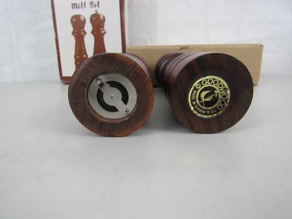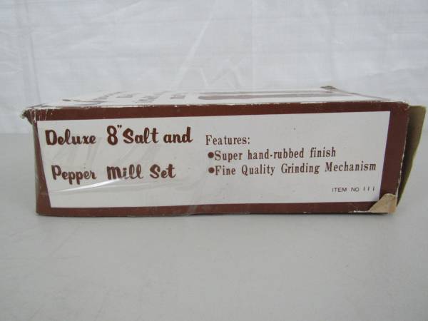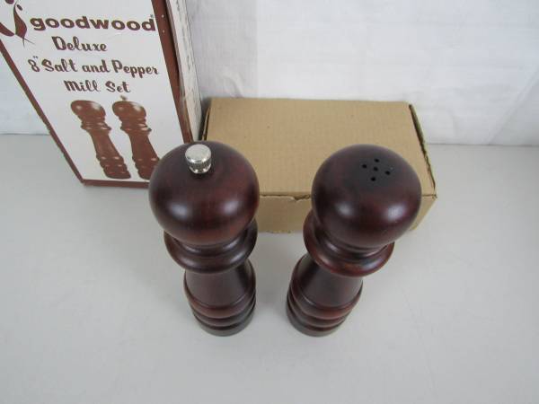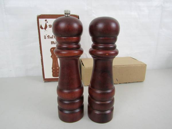 The salt shaker and pepper mill are 8" tall, and made of wood. The box was opened for inspection, and the set was never used. Box has some age and storage wear. See photo's
