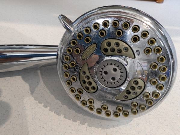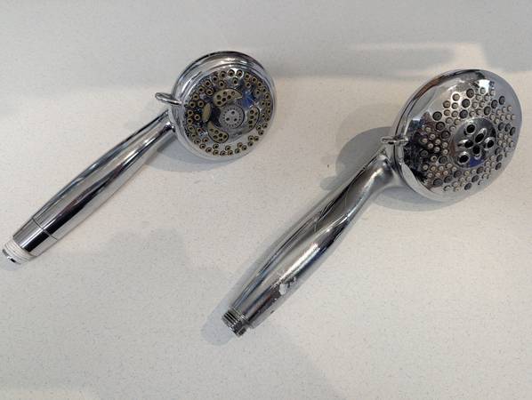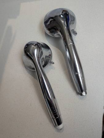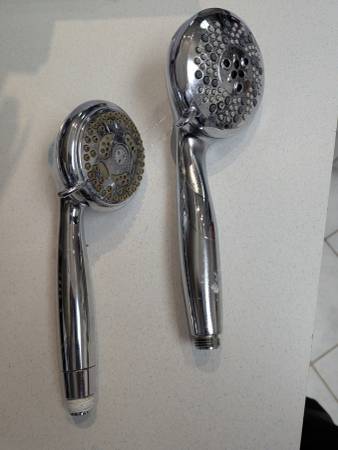 the larger shower head is a MOEN and the other is unbranded and both have 7 spray modes. Both in excellent condition. Come and get them one for $5 or both for $10. Come and get them. I only accept...