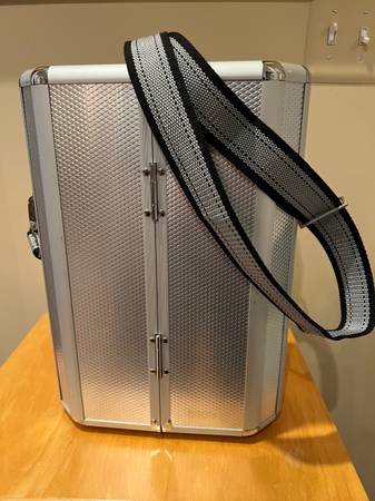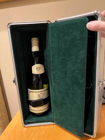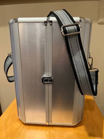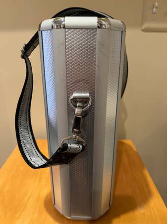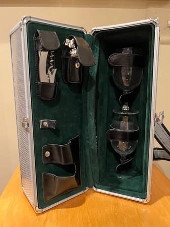 Lightweight aluminum wine carrying case with shoulder strap. Interior is lined with hunter green velvet and has black leather straps. Includes two wine glasses, corkscrew, bottle stopper and space...