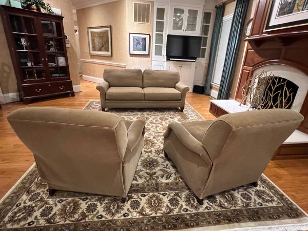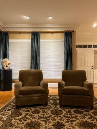 Pair of Perrington club reclining chairs by Ferrell Mittman. Upholstered with sturdy wear resistant taupe colored mohair fabric. $250 each or $400 for the pair.