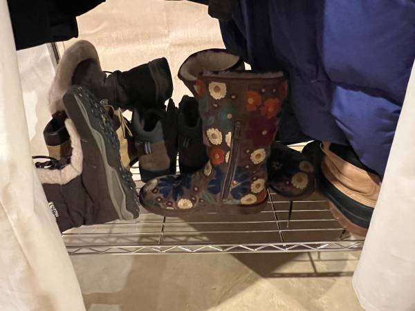 Rolling garment rack with steel frame and canvas cover with button closure. Clothes hang from rod across top and footware sits on shelf at base.