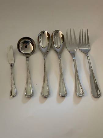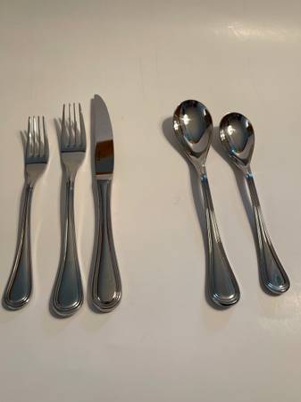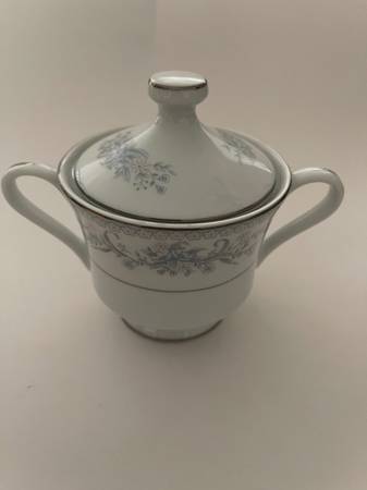 8 place setting China dinnerware set for sale. Includes 8 dinner plates, 8 salad plates, 8 soup bowls, 8 cups and 8 saucers, a large serving plate, and sugar bowl with lid and creamer. Also included is 12 place setting of cutlery, including dinner forks, salad forks, small spoons and soup spoons, knives, and 6 piece serving set. The cutlery is brand new and never used. The china is like new with no chips or cracks. Price is based on replacement value of china. Cutlery was bought for over $100 and is brand new/never used, and is also made by Mikasa. The pattern is Dresden Rose L9009 Japan. Will entertain serious offers.