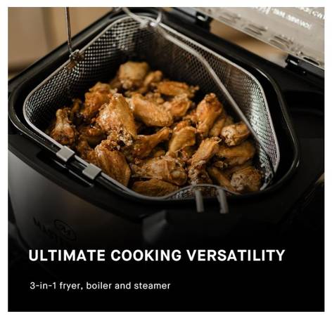 3-in-1 electric fryer lets you fry, steam, or boil your favorite foods for the entire family without having to clutter your kitchen with multiple appliances Extra-large, 10.6-quart electric cooking pot capacity with the ability to fry up to a 20-pound turkey, crawfish boil, or a family-sized portion of steamed veggies Healthier design reduces fat with 1.3 times less oil needed than used in a traditional deep fat fryer; Magnetic breakaway cord for safety