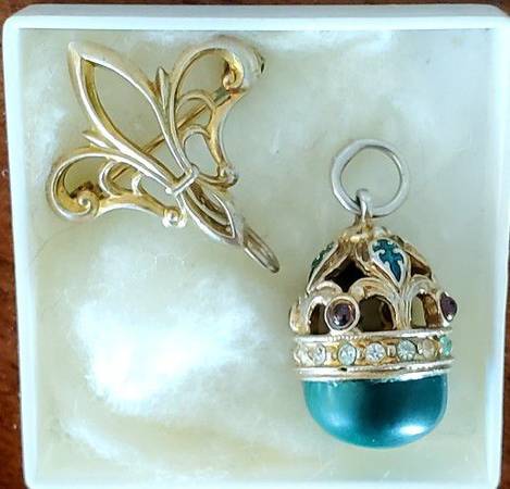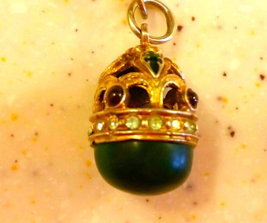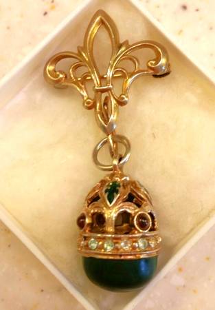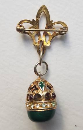 Dime sized with malachite base and gold tone (not 14k) top with colored gemstones. Includes a fleur de lis lapel attachment if you want to wear it as a pin and not as a pendant. $75 firm.