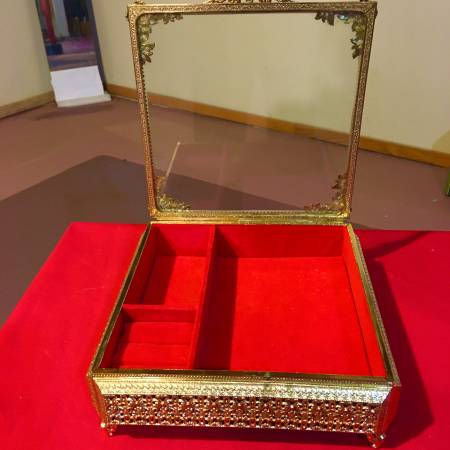 This type of box is typically used for storing rings, bracelets, necklaces, brooches, or other small collectible items, and is often kept on a dresser or vanity for both decorative and practical purposes.