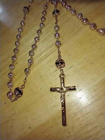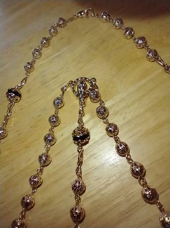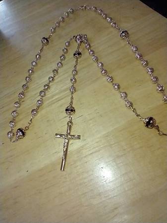 I have a beautiful Fashion Gold with black crystal beads Rosary Necklace for sale. It is made of 24 kt gold layered over a bronze center. The gold beads have a Filigree pattern. The necklace measures 26 inches long and 32 inches from the lobster claw clasp to the tip of the crucifix. I am asking $70.00 cash. ( Rose25C )
