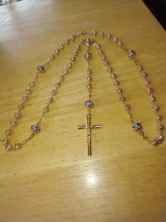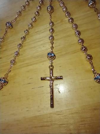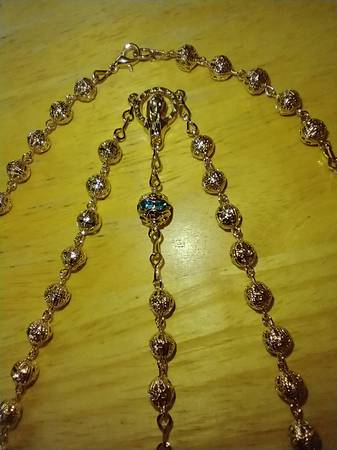 I have a beautiful Fashion Gold with blue crystal beads Filigree Rosary Necklace for sale. It is made of 24 karat gold layered over a bronze center. The necklace measures 26 inches long and 29 inches from the lobster claw clasp to the tip of the crucifix. I am asking $70.00 cash. ( Rose25B )