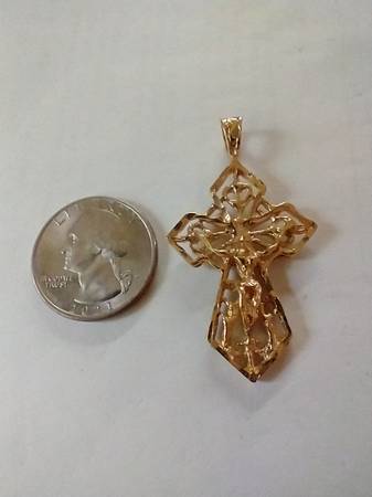 I have a Fashion Gold Cross w/ Corpus Pendant for sale. It is made of 24 karat gold layered over a bronze center. I am asking $22.00 cash.