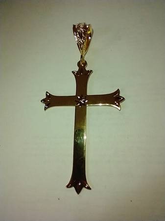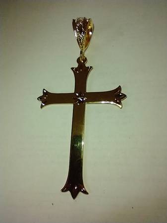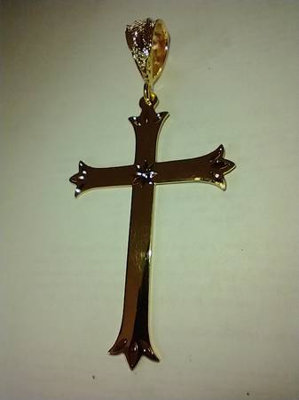 I have a Fashion Gold Cross Jumbo Pendant for sale. It is made of 24 karat gold layered over a bronze center. The pendant measures 2 inches wide and 4 inches from the oversized bezel to the bottom...