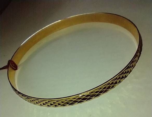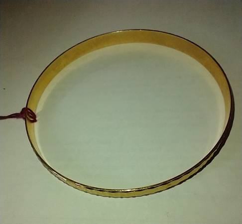 I have a Fashion Gold Diamond Cut Bangle Bracelet for sale. It is made of 24 karat gold layered over a bronze center. The bracelet measures 3 inches in diameter. I am asking $12.00 cash.