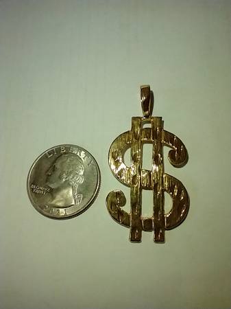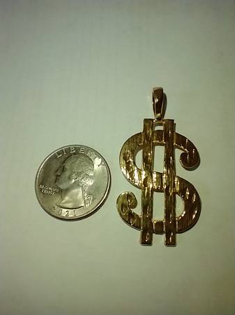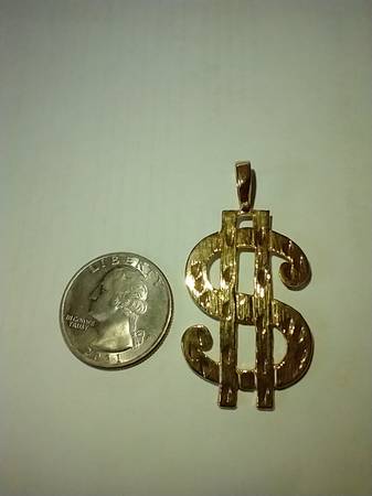 I have a Fashion Gold Dollar Sign Pendant for sale. It is made of 24 karat gold layered over a bronze center. I am asking $22.00 cash.