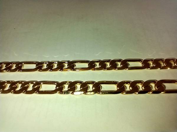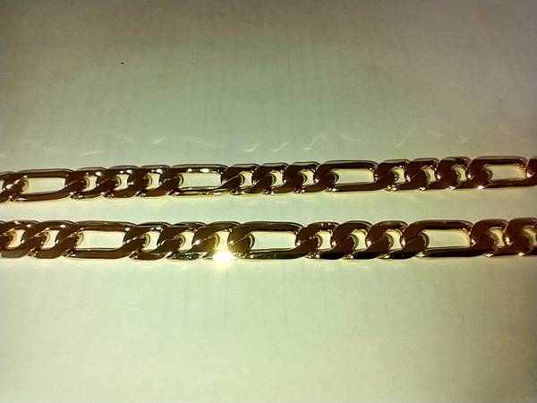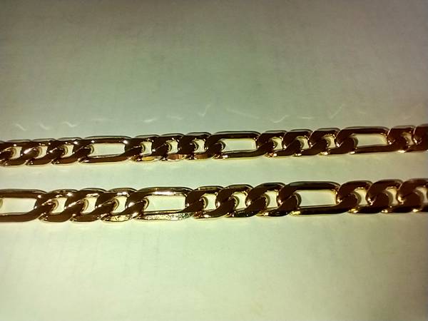 I have a Fashion Gold Figaro necklace for sale. It is made of 24 karat gold layered over a bronze center. It measures 30 inches in length. I am asking $85.00 in cash. ( 9E )