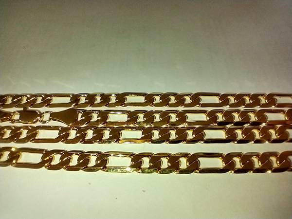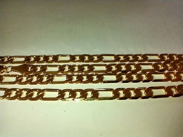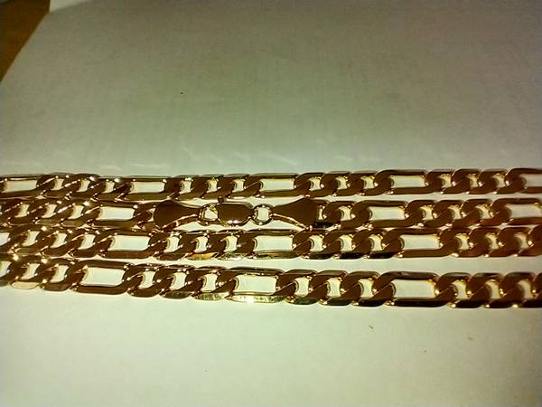 I have two Fashion Gold Figaro necklaces for sale. They are made of 24 karat gold layered over a bronze center. The chains measure 24 inches. I am asking $55.00 cash for each one. ( 9D )