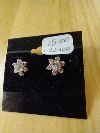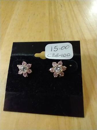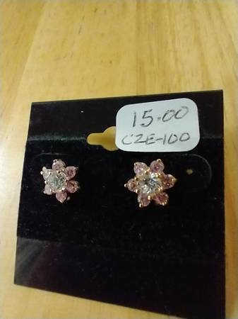 I have 2 pairs of Fashion Gold Flower Earrings for sale. They are made of 24 karat gold layered over a bronze center. The flower design is made of 6 pink cubic zirconia with a larger clear cubic zirconia in the center. I am asking $15.00 cash for each pair.