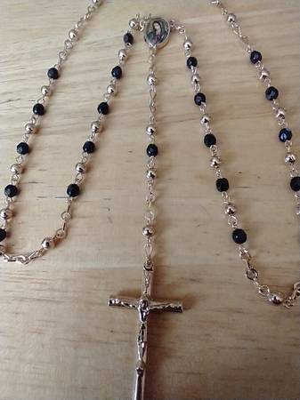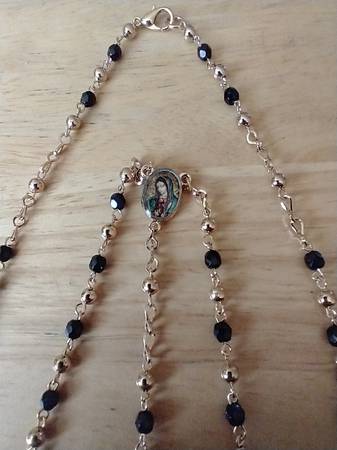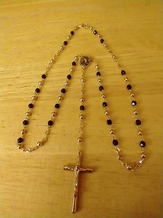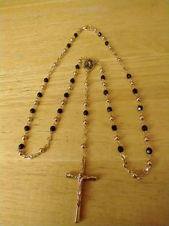 I have a beautiful Fashion Gold with Gold and Black Bead Rosary Necklace for sale. It is made of 24 karat gold layered over a bronze center. The beads are gold and black stones. The necklace measures 22 inches and 27 inches from the lobster claw clasp to the tip of the crucifix. I am asking $55.00 cash.