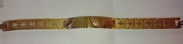 I have a Fashion Gold ID Bracelet for sale. It is made of 24 karat gold layered over a bronze center. The bracelet measures 7 3/4 inches long by 1/2 inch wide. I am asking $40.00 cash. ( ID18 )