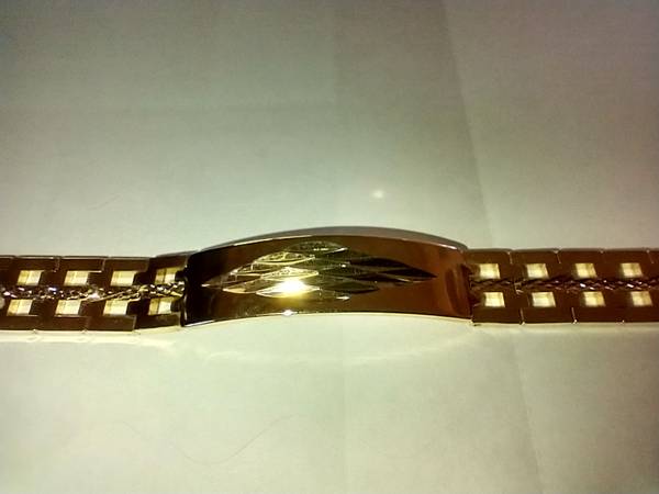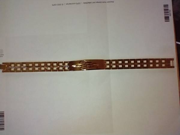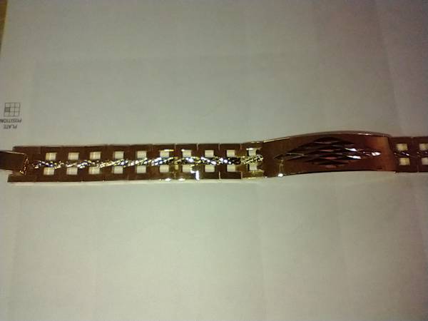 I have a Fashion Gold ID Bracelet for sale. It is made of 24 karat gold layered over a bronze center. The bracelet measures 8 inches long by 1/2 inch wide. I am asking $45.00 cash. ( ID15 )