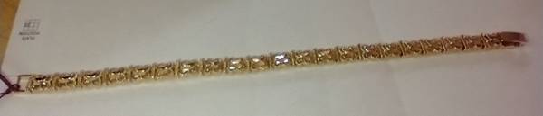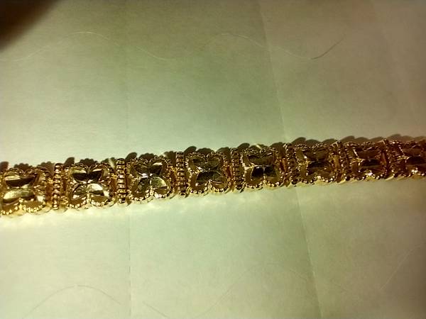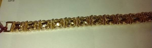 I have a Fashion Gold Ladies Bracelet for sale. It is made of 24 karat gold layered over a bronze center. The bracelet measures 7 inches long by 3/8 inch wide. I am asking $42.00 cash. ( LB43 )