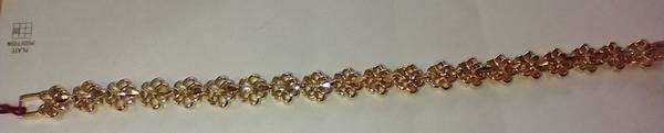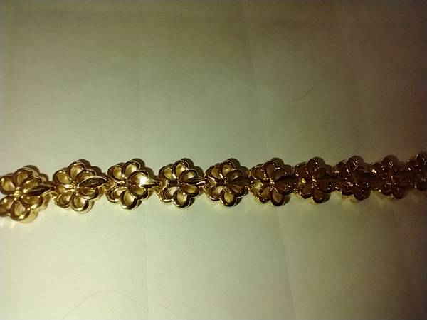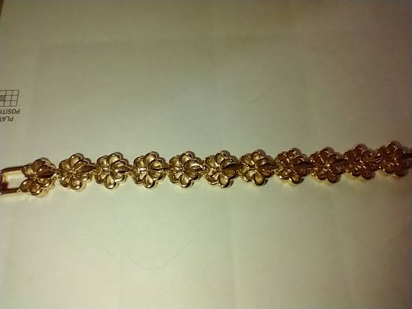 I have a Fashion Gold Ladies Bracelet for sale. It is made of 24 karat gold layered over a bronze center. It measures 7 inches long by 3/8 inch wide. I am asking $32.00 cash. ( LB29 )