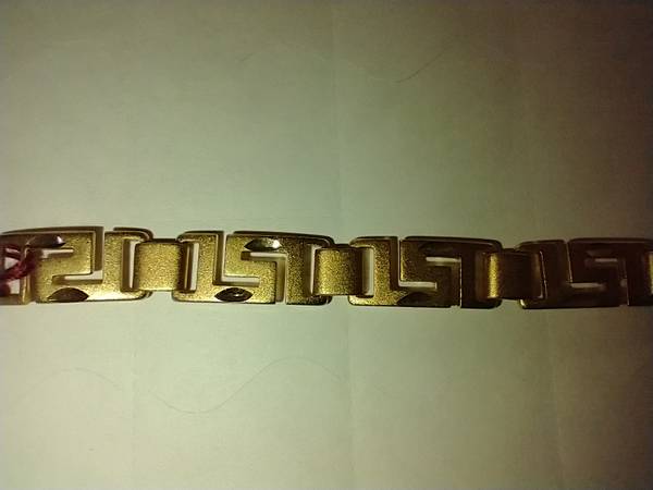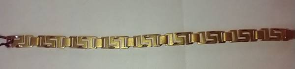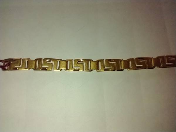 I have a Fashion Gold Ladies Bracelet for sale. It is made of 24 karat gold layered over a bronze center. It measures 7 1/4 inches long by 3/8 inch wide. I am asking $28.00 cash. ( LB120 )