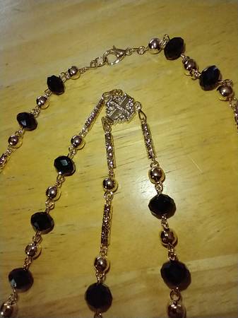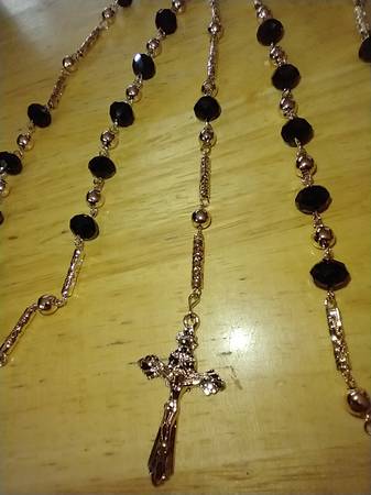 I have a beautiful Fashion Gold Long Bar Black Crystal Bead Rosary Necklace for sale. It is made of 24 karat gold layered over a bronze center . This necklace measures 28 inches long and 34 inches from the lobster claw clasp to the tip of the crucifix. I am asking $70.00 cash. ( Rose25B)