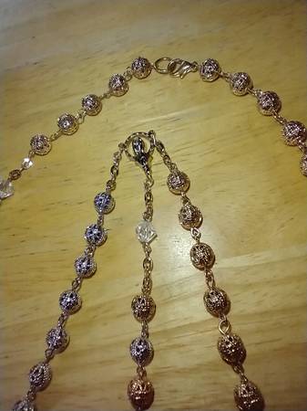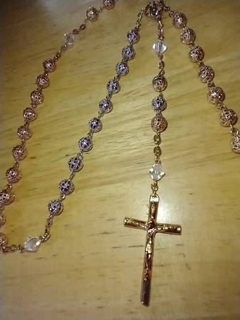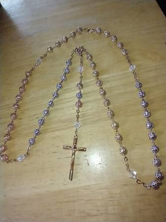 I have a beautiful Fashion Gold/Rhodium and clear crystal bead rosary necklace for sale. It is made of 24 karat gold and Rhodium layered over a bronze center. The necklace measures 26 inches long and 31 inches from the lobster claw clasp to the tip of the crucifix. I am asking $50.00 cash. ( Rose18a )