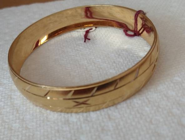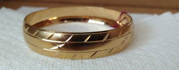 I have a 2 1/2 inch Fashion Jewelry Gold Bangle Bracelet for sale. This bangle is in new condition and is made from 24 karat gold layered over a bronze center. The bracelet is decorated with diamond etched pattern along the edge of the bangle. I am asking $33.00 cash.