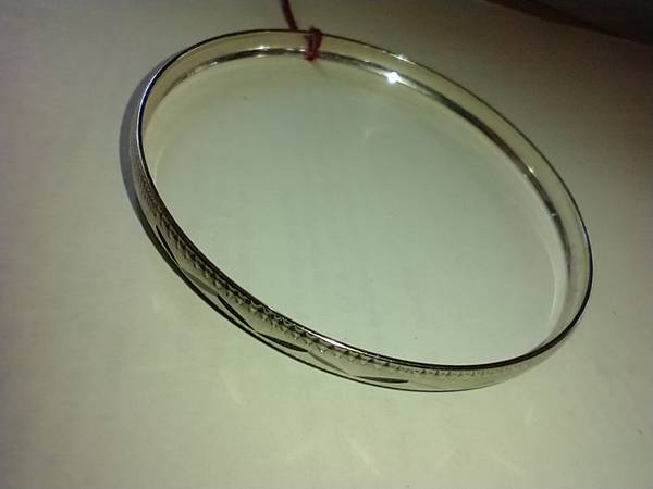 I have a Fashion Rhodium Diamond Cut Bangle Bracelet for sale. It is made of Rhodium layered over a bronze center. The bracelet measures 3 inches in diameter. I am asking $21.00 cash.