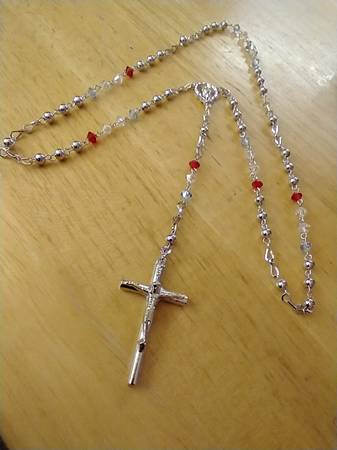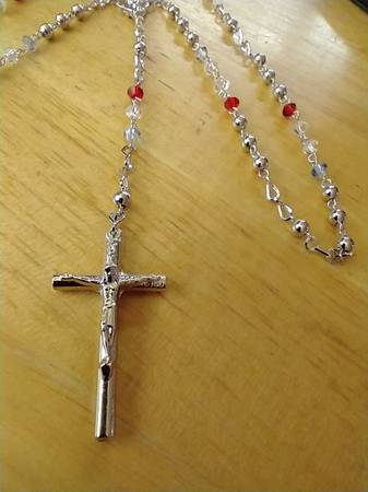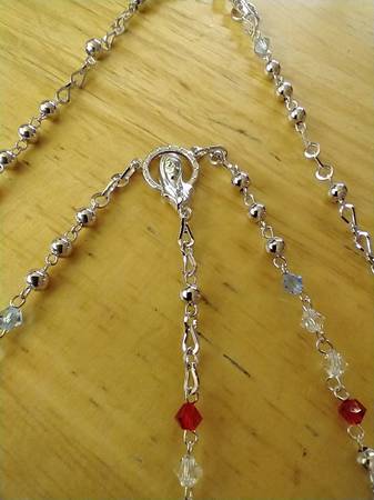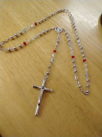 I have a beautiful Fashion Rhodium Rosary Necklace for sale. It is made of Rhodium layered over a bronze center. The beads are made of Red, Blue and Clear crystals. The necklace measures 20 inches. The rosary measures 15 inches from the lobster claw clasp to the tip of the crucifix. I am asking $42.00 cash.