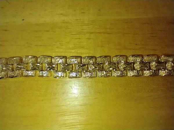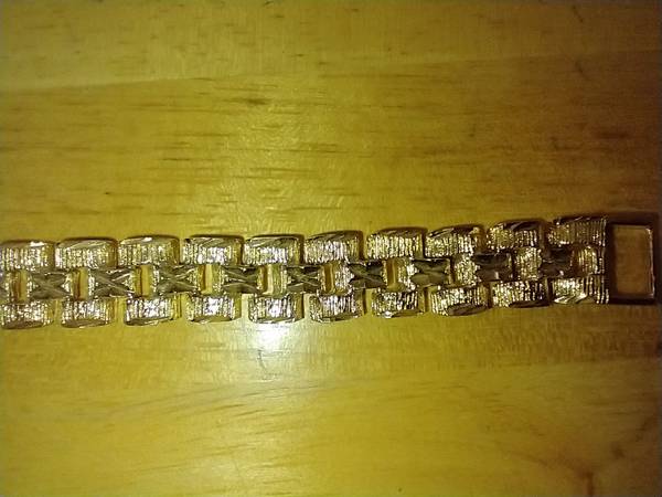 I have a Men's Fashion Gold bracelet for sale. It is made of 24 karat gold layered over a bronze center. The bracelet measures 8 inches long by 1/2 inch wide. I am asking $90.00 cash. ( MNB5 )