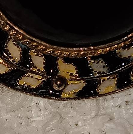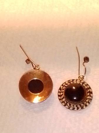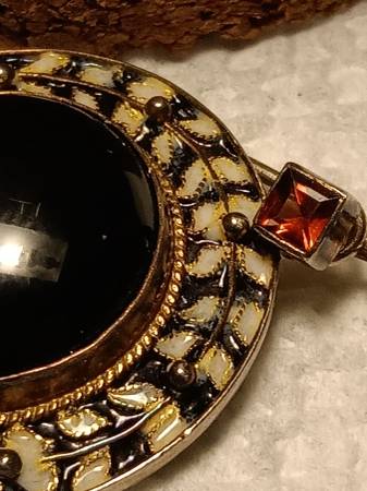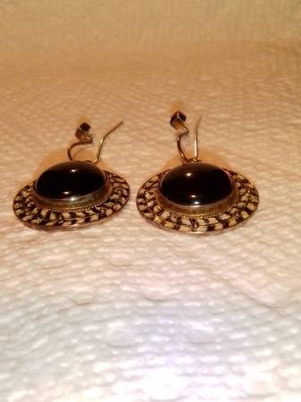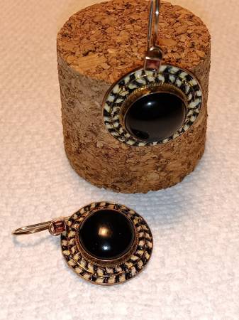I've got a pair of Vintage 925 Sterling/14k Gold Vermeil Earrings with a center setting of Black Onyx and surrounding hand painted vine of black and white enamel. The wire hooks are each tipped with a 4 prong mounted square cut Ruby. Earrings are Marked "925" and Makers Mark Mark "SI". Earrings are in EXCELLENT COSMETIC CONDITION from an owner and home with No Smoking /No Pets.