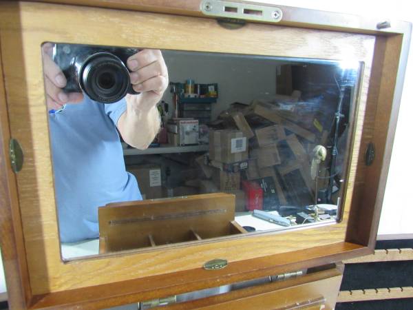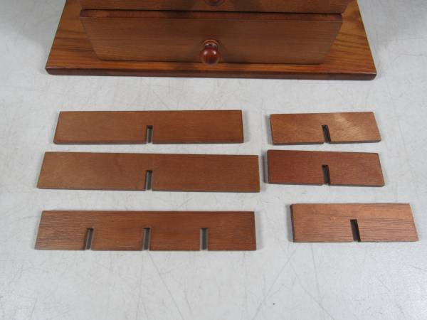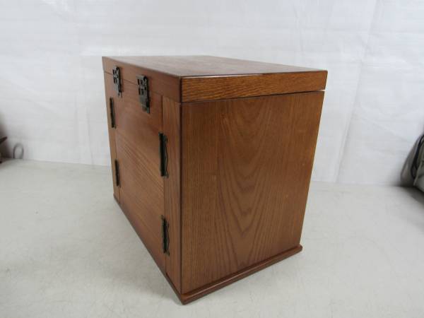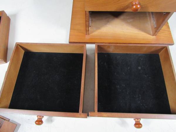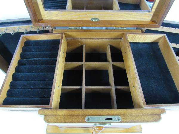 The Jewelry organizer/box fully opened is 24 5/8" width X 18 1/8" height X 10" depth, and when closed the Jewelry organizer/box is 11 3/4" width X 10 7/8" height X 9 1/4" depth. The mirror is 9 1/4" X 5 3/4". Made of wood and weighs 9 pounds 13 ounces empty. Good condition with some minor usage wear. There is no key for the lock. Comes with some extra dividers. Lined with black colored felt material.