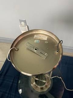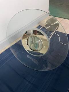 Modern looking, glass base is 19.5 inches in diameter, ceiling base diameter is 8 inches and height is 25 inches. Comes with working light bulb.