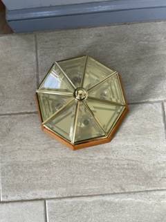 Octagon shaped - comes with 4 working light bulbs, measures 13 inches in diameter and is 7 inches tall.