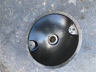 Metal sign base has 2 bolt holes and the hole for the sign which is 1 and 11/16 inches in diameter. The diameter of the entire base is 13.5 inches and the height is 4.5 inches. Have more than one if...