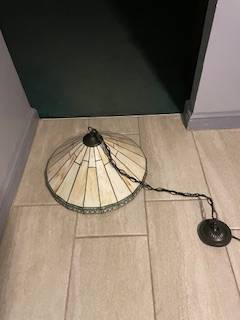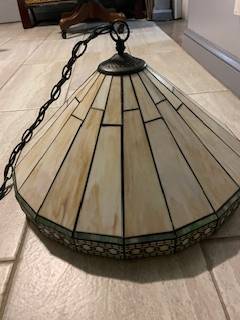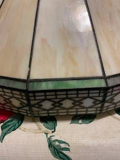 Off white beige with green trim and white around the edge, comes with 5 working bulbs, measures 20 inches in diameter and 11 inches high, the chain is 33 inches long