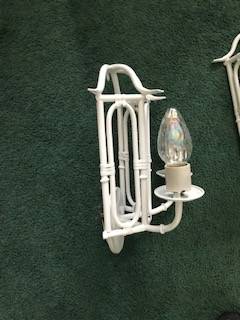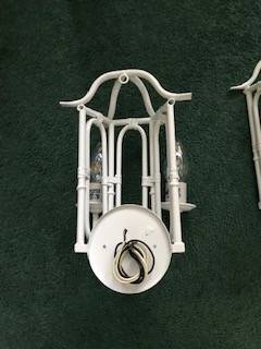 Metal, comes with 4 new working light bulbs, 12 inches long, 8 inches across and comes out 6 inches when mounted on the wall.