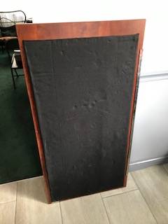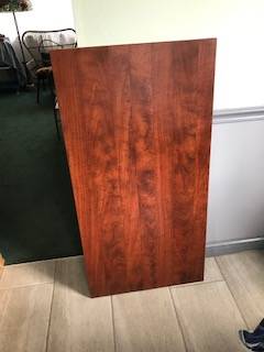 Heavy duty plastic that looks like wood, measures 46.25 by 23.25 inches and is 3/4 inches thick, has a long hinge along one edge and some padding on the back. Could be used as a desk top, counter...