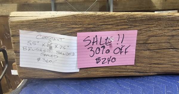 This is a Reclaimed Chestnut beam 6" thick x 6" deep x 75" long. It has been wire brushed, sanded and sealed, ready to install! Was $360. Sale price 30% OFF $240 $ale ends 10-11-25 for details call...