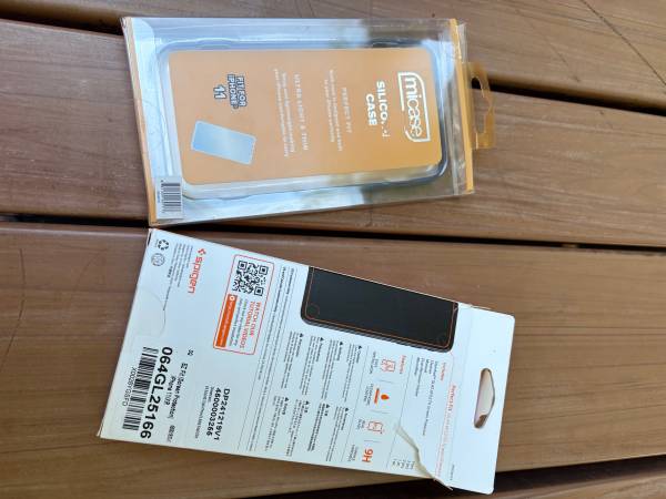 Screen protector by Spigen: comes with glass protector, wipes, dust stickers, microfiber cloth, squeegee, plastic applicator tool thingy and instructions.