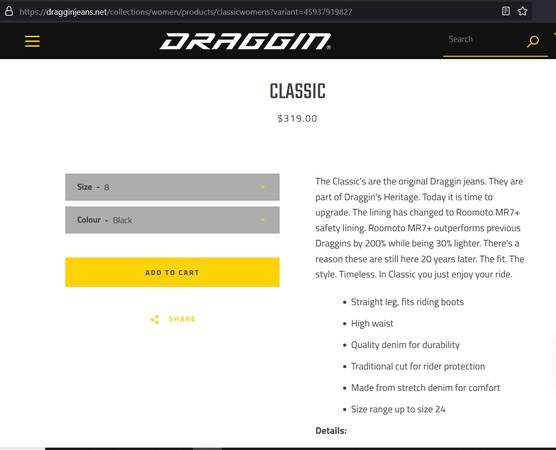 The Classic's are the original Draggin jeans. They are part of Draggin's Heritage. Today it is time to upgrade. The lining has changed to Roomoto MR7+ safety lining. Roomoto MR7+ outperforms previous Draggins by 200% while being 30% lighter. There's a reason these are still here 20 years later. The fit. The style. Timeless. In Classic you just enjoy your ride.