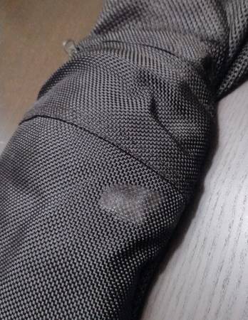 Size is L (12-14), seems like a 12 to me, although all Joe Rocket pants are long too. One blemish shown in photo about the size of a quarter on knee.