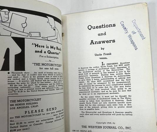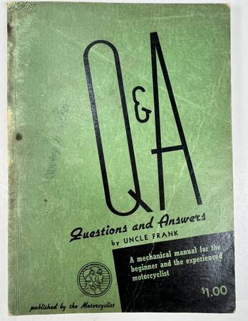 Questions and Answers by Uncle Frank 1940 Edition Motorcycle Manual, Army book A great collectible for motorcycle history. Please see photos for condition. Please let me know if you have any...
