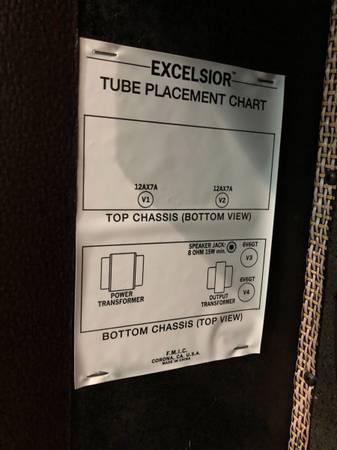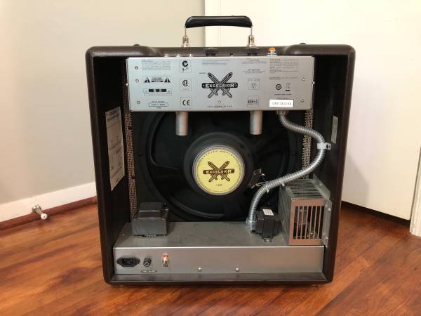 The 13-watt Excelsior elegantly encloses a single 15 inch Eminence Legend speaker which is perfectly voiced to broadcast all that great tube tone- provided by a pair of 6V6 tubes in the power section and a pair of 12AX7s in the preamp. A bottom-loaded primary chassis and top-loaded control chassis offer operating convenience and low noise. Other distinctive features include Instrument, Microphone and Accordion inputs that each have individually optimized circuitry; Tremolo circuit with speed control, bright/dark tone switch (for treble or bass emphasis), volume control and 1/4” internal speaker disconnect that lets the amp drive an external speaker enclosure.